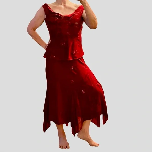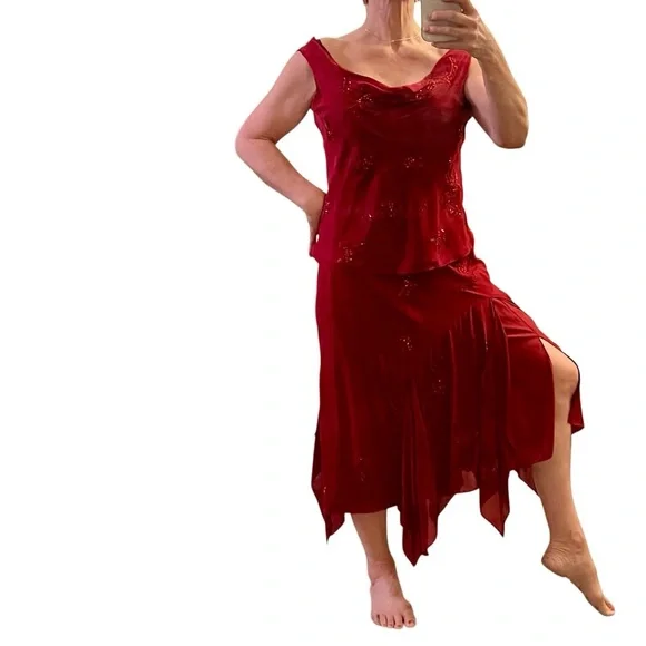 ICE Tiered Asymmetrical handkerchief fairy hem 100% Silk Ciffon Overlay Semi Sheer Split Hem with lace insert beading Chic sleeveless dress set in a vibrant red. Perfect for special occasions.Vintage Y2K Silk Red Beaded Bateau Neck Sleeveless Party Dress 2 Piece Skirt Set Cut on the Bias for a flattering individual fit for your curves. Top has a lace underlining with a soft neck drapeSize Large