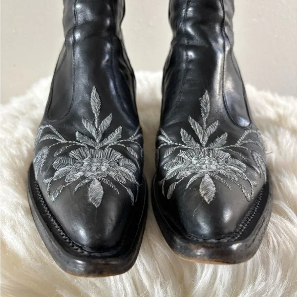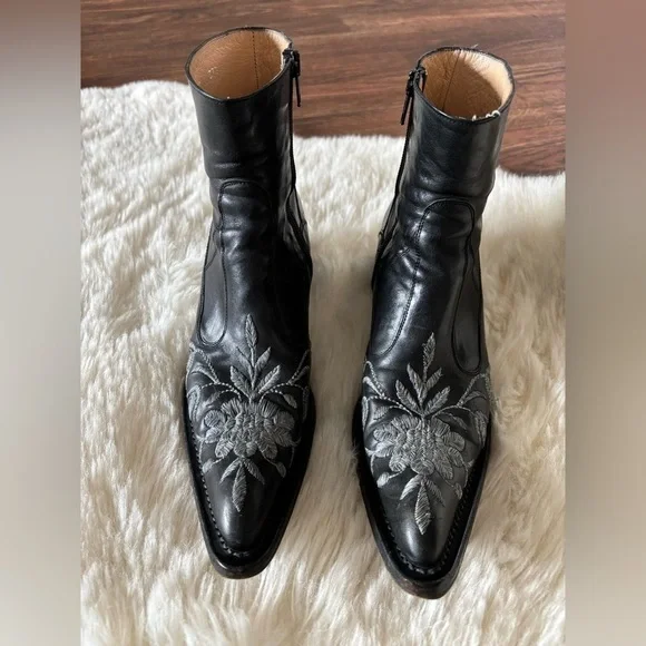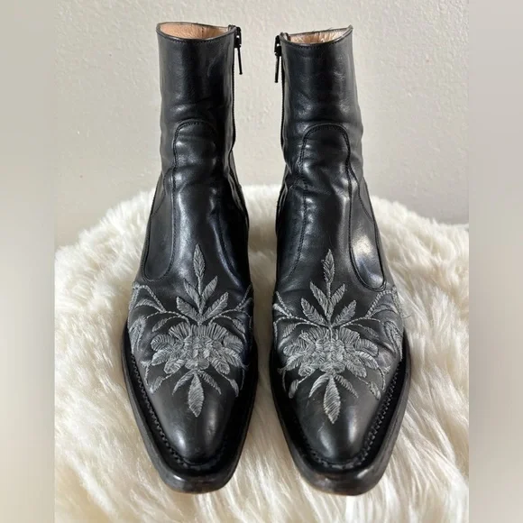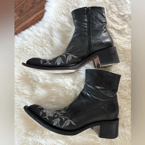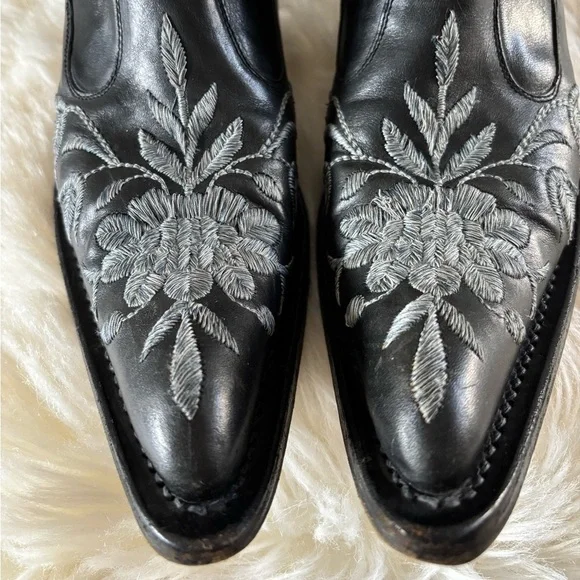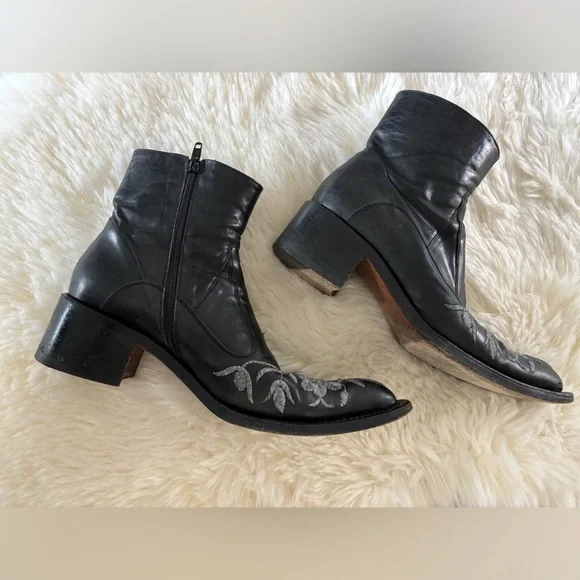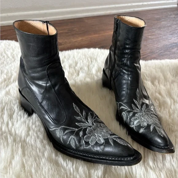 GIANNI BARBATO EMBROIDERED LEATHERWESTERN BOOTSGianni BARBATO Handmade in Italy, sz 37.5 or US sz 7.5 - imo- TTS; Block stacked heel amazing embroidered floral black leather ankle pointy toe western cowboy boots. Excellent condition, easy side zip entry. Amazing, rare, high quality boots! Will ship right away.Boho, Bohemian