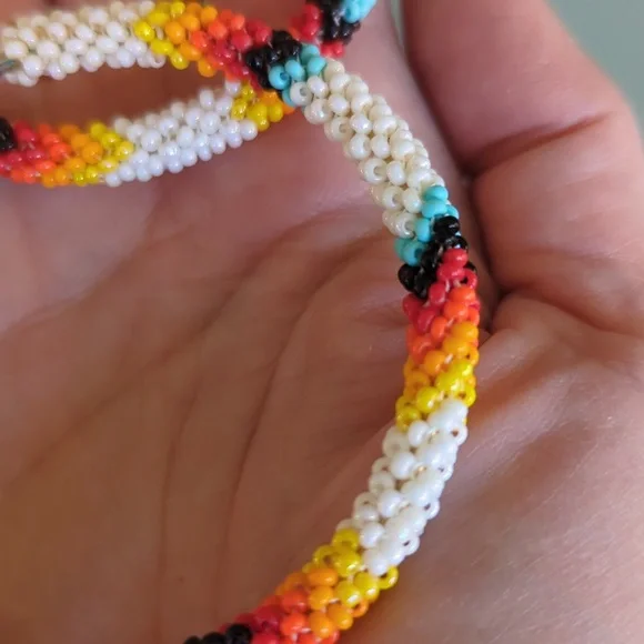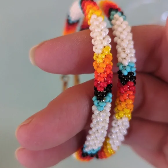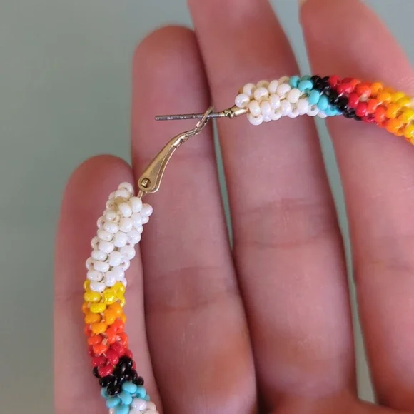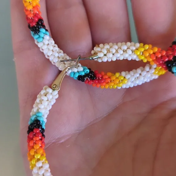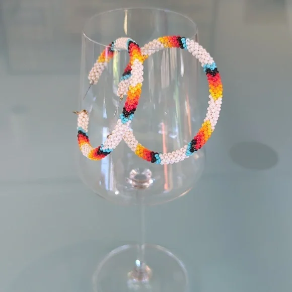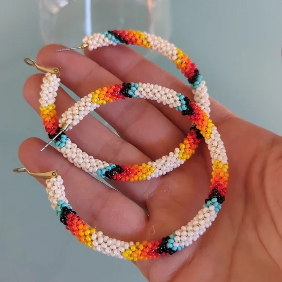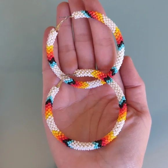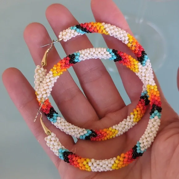 Style: Bohemian, Native American TribalSize: Approximately 2.8" wideCondition: Brand new, handmade with no original packaging. Shipped in a box for protection.These earrings are one of a kind!Details:These stunning large hoop earrings were beautifully crafted by a young artisan from the Seneca Nation in Western New York. With their vibrant, colorful beadwork, they capture the essence of Bohemian and Native American tribal style.Perfect for adding a bold statement to any outfit, these earrings are a unique blend of culture and fashion.HandmadeJewelry, NativeAmerican, BohemianStyle, WesternFashion, LongTasselEarrings, ColorfulEarrings, BeadedJewelry