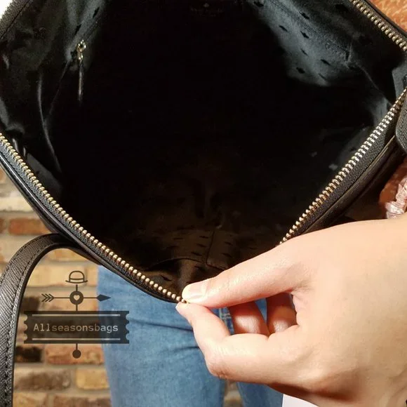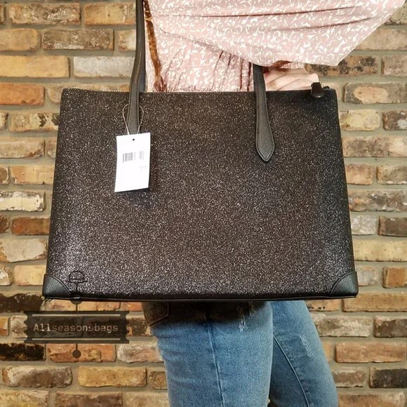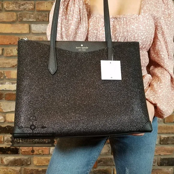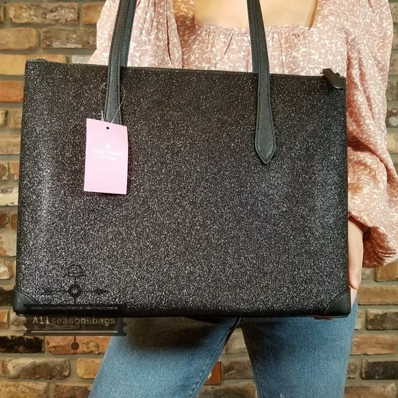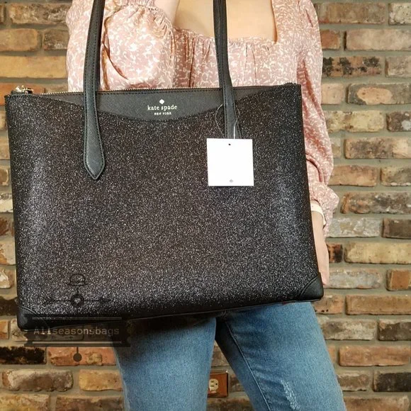 ** Authentic Kate Spade New York Lola Glitter Shimmy Glitter Tote Large Purse Bag BLACK*** CLOSET CLEAR OUT!!! LAST PRICE - no more reductions, FIRM PRICE ***Model wears size XS so items may appear larger in photos. PLEASE check all MEASUREMENTS before making a purchase to ensure this is the exact size that you’re looking for. two way spade jacquard lininginterior 1 Zipper Pocket and 2 Slip PocketsApproximate measurements: 14" (L) x 10.5" (H) x 5" (D)** New with tag bag, purse, trendyPlease be aware that every bag is unique and the pattern you receive may differ from the pattern in the photos!