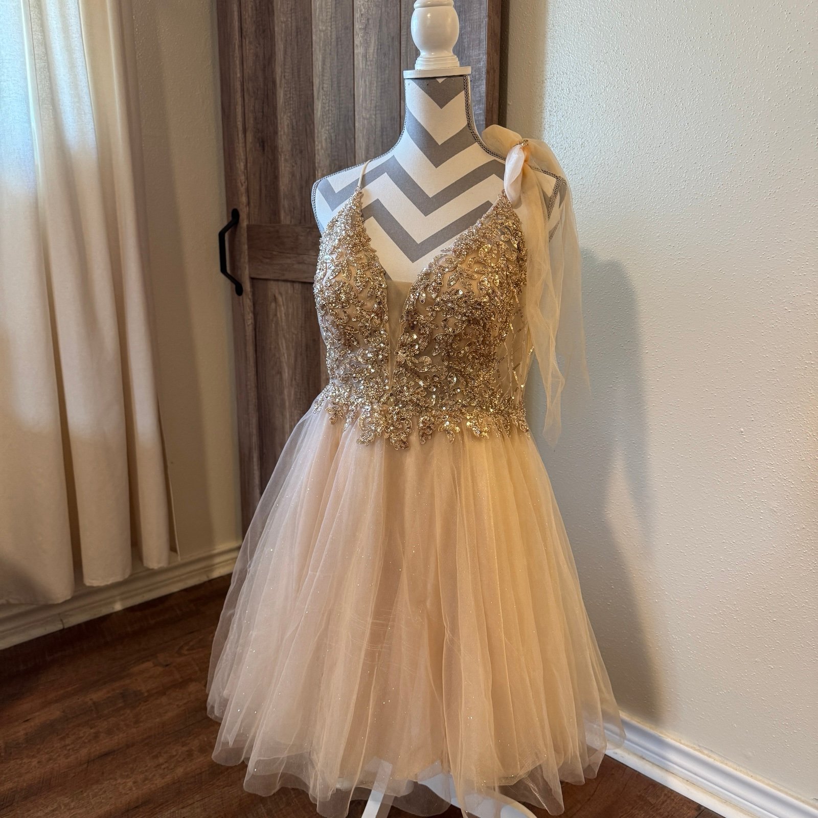 Champagne gold short formal dress with sequin beaded bodice and tulle skirt perfect for prom, homecoming, or cocktail. This dress has two layers of satin and three layers of the tulle fabric. One of which has a very subtle glitter to it. Do you want to be Cinderella for Halloween? This is perfect.