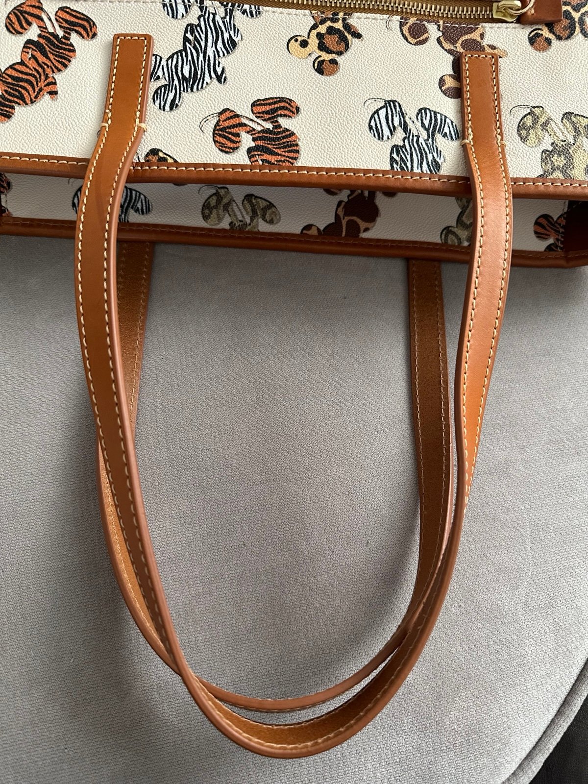 Disney Dooney & Bourke Mickey Mouse Animal Print Tote in Excellent Used Condition. Smoke free. Bag pictured is the exact one you’ll receive. Please view all photos carefully since this bag was (gently & seldomly) used. There could be some minor surface type (not deep) scratches etc to the leather handles & trim. No returns, thanks.