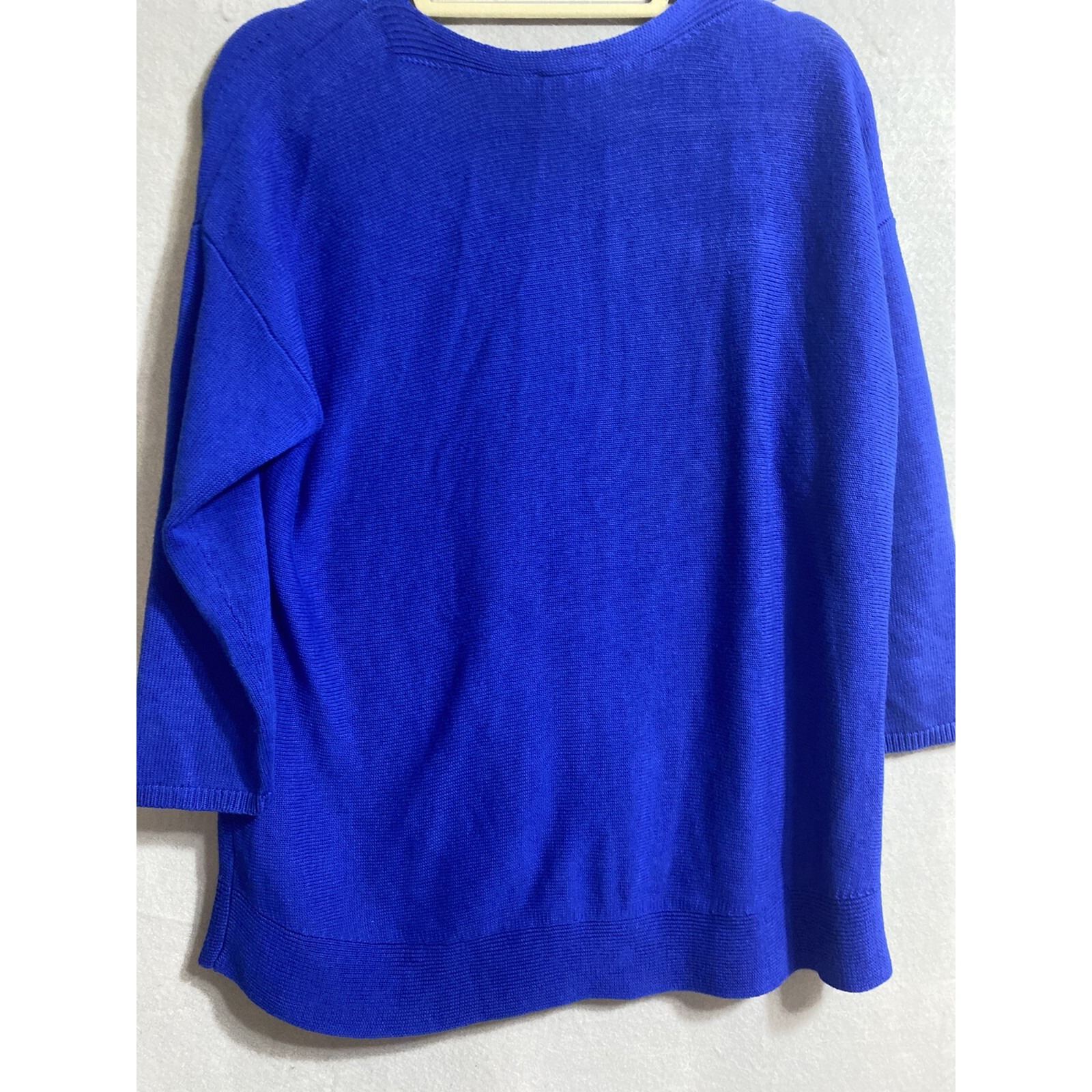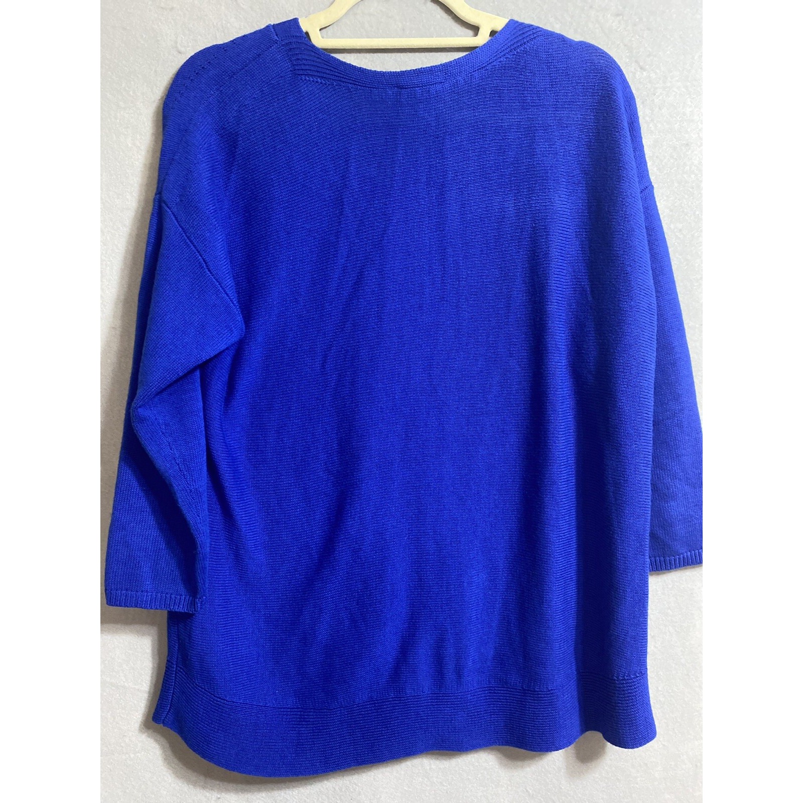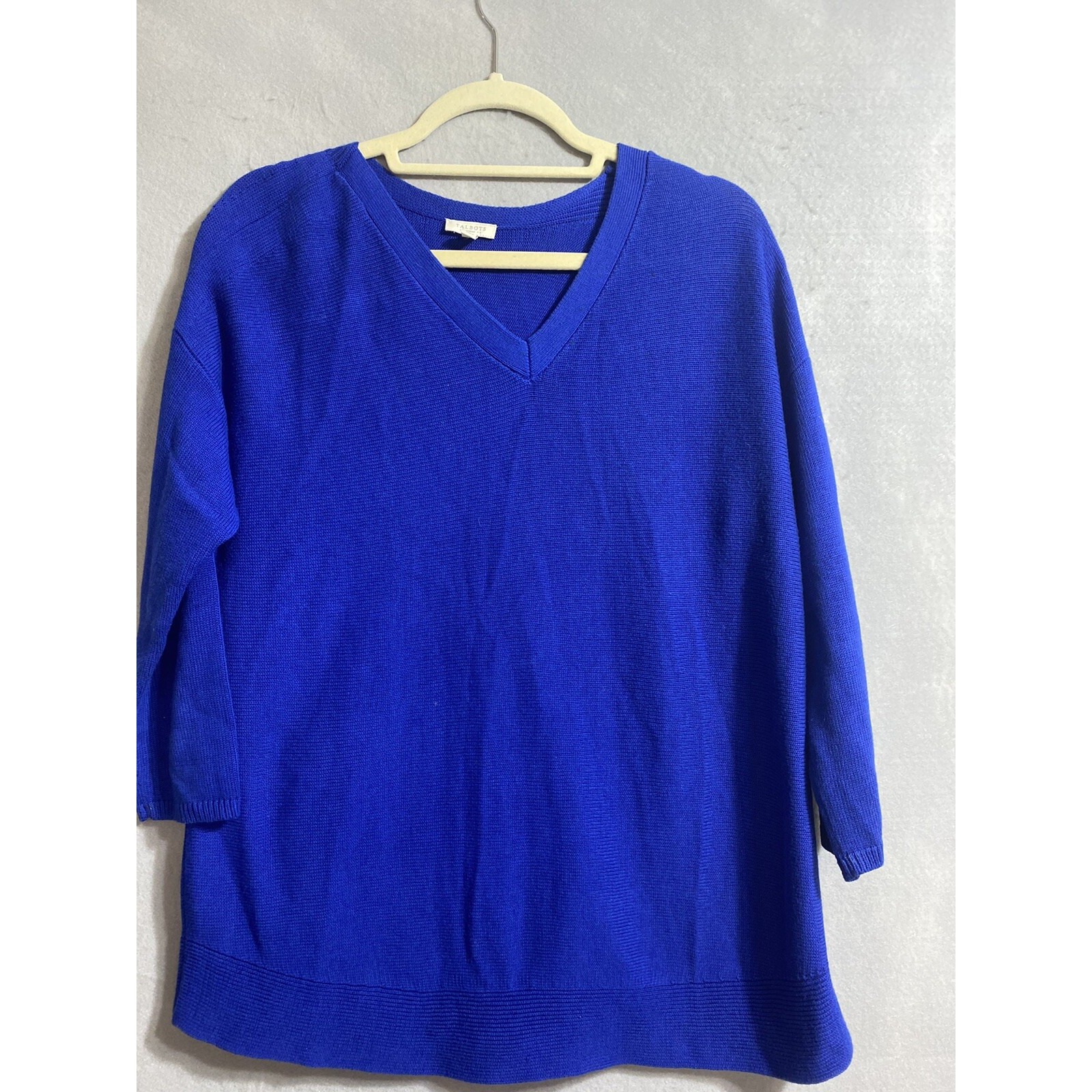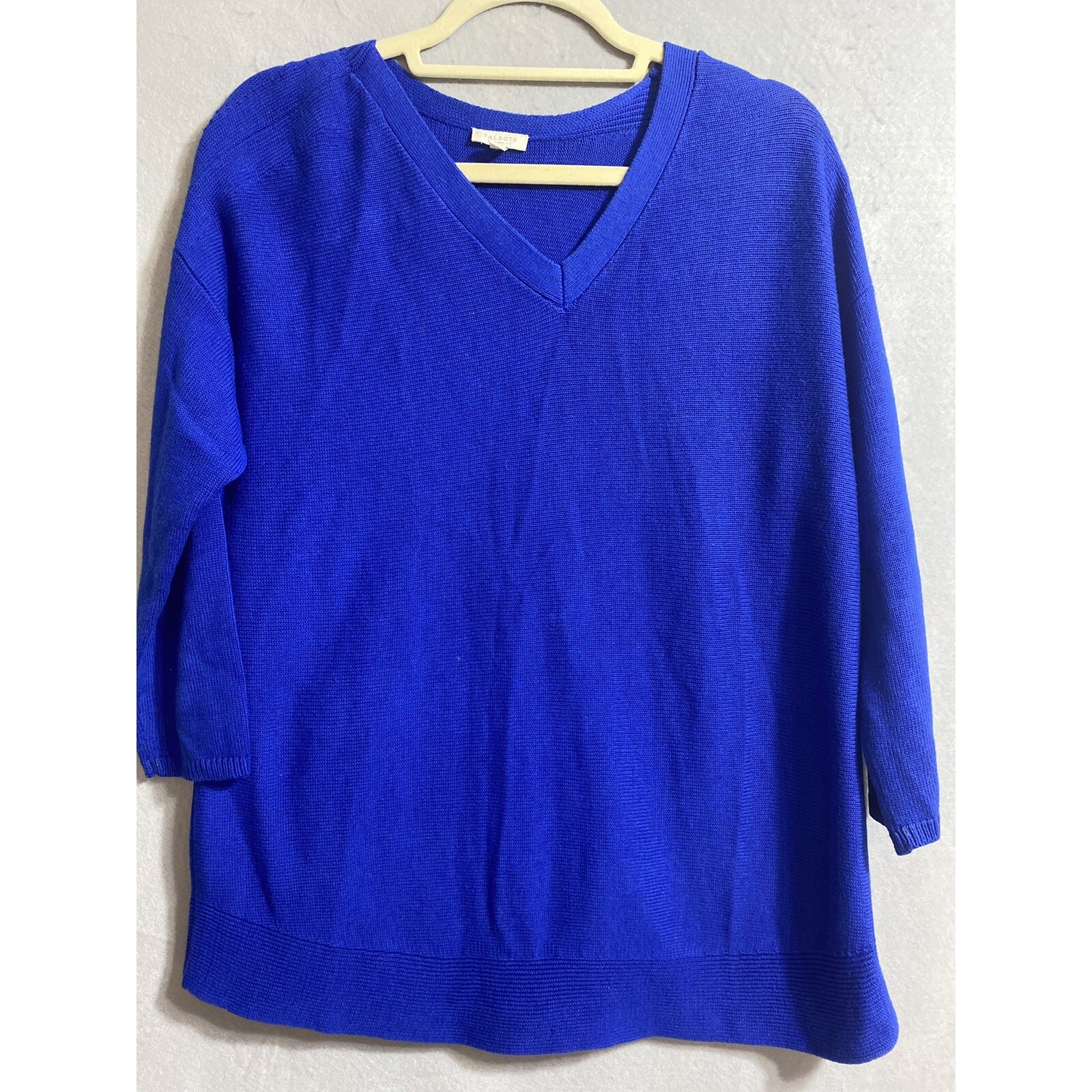 Wrap yourself in the cozy comfort of this Talbots blue cable knit pullover sweater, tailored for a classic fit that flatters without sacrificing ease. The versatile 3/4 sleeves lend a timeless appeal, making it an ideal choice for those transitional days when layers are necessary. Crafted from a soft cotton blend, this sweater promises both warmth and breathability. With its understated V-neck design and solid color, the sweater can easily be paired with a variety of bottoms for casual outings or travel. The knit fabric ensures it's machine washable for easy care, while the Americana theme adds a touch of homegrown charm. The piece is a size X, measuring 46" in chest and 27" in length, to complement your wardrobe with a touch of practical elegance.