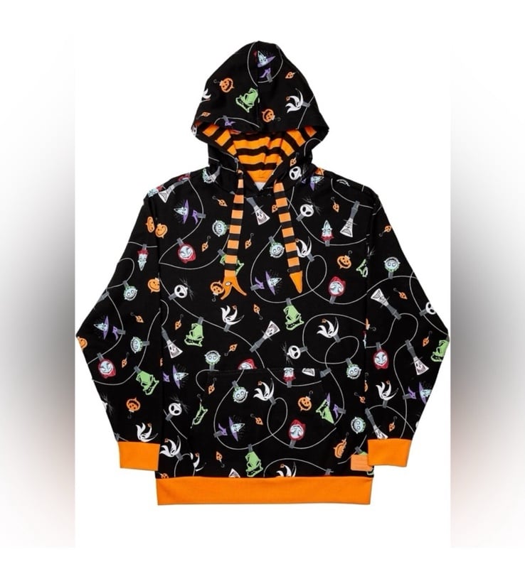The Loungefly Nightmare Before Christmas Ornaments Unisex Hoodie is made of French Terry cotton (60% cotton, 40% polyester). Extra-large lanyard-style drawcords add versatility in wear and fit and are perfect for displaying your favorite pins. Cuffs and waistband are 95% cotton and 5% Spandex.