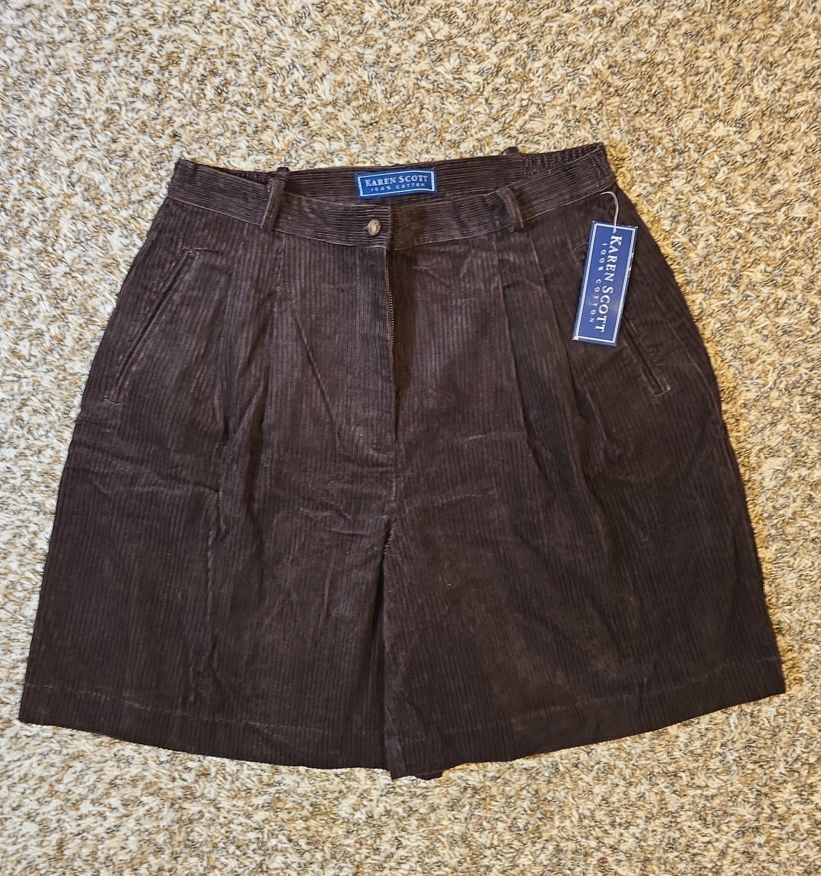 Brown 100% Cotton Corduroy High Waisted Pleated Shorts w partial Elastic waist for flattering fit. Comes w removable black belt. Chino Cargo style.