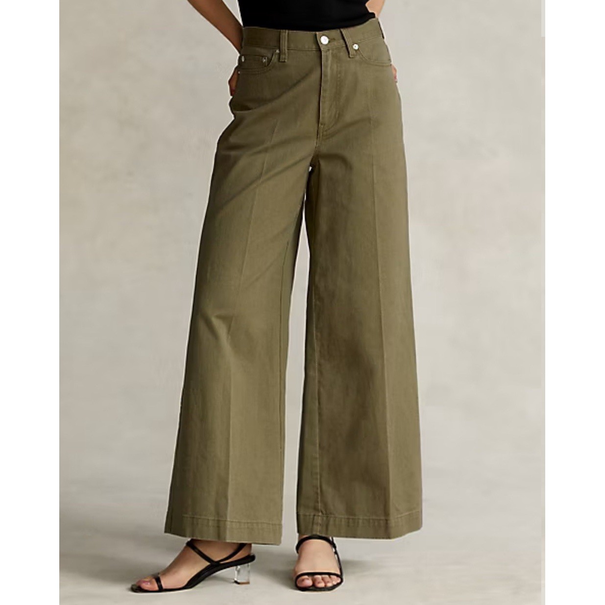 The Polo Ralph Lauren Cotton Twill Wide-Leg Cropped Pant in size 14 features a solid olive green color, high-rise construction, and a flat front design. Made from comfortable cotton twill fabric, these pants have a 34-inch waist and a 26-inch inseam. With a wide-leg (14.5 inches width) style and cropped length, they are perfect for a city or army-inspired look, adding a touch of preppy flair to any outfit.