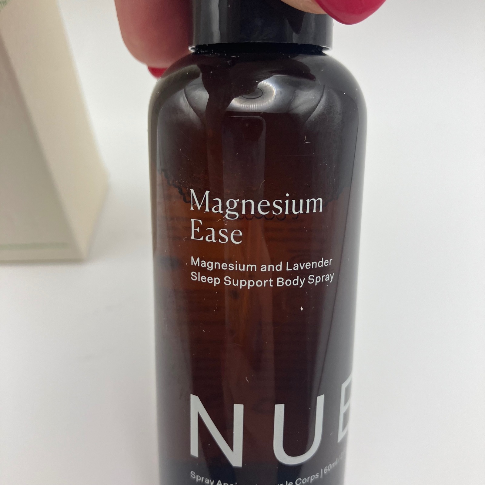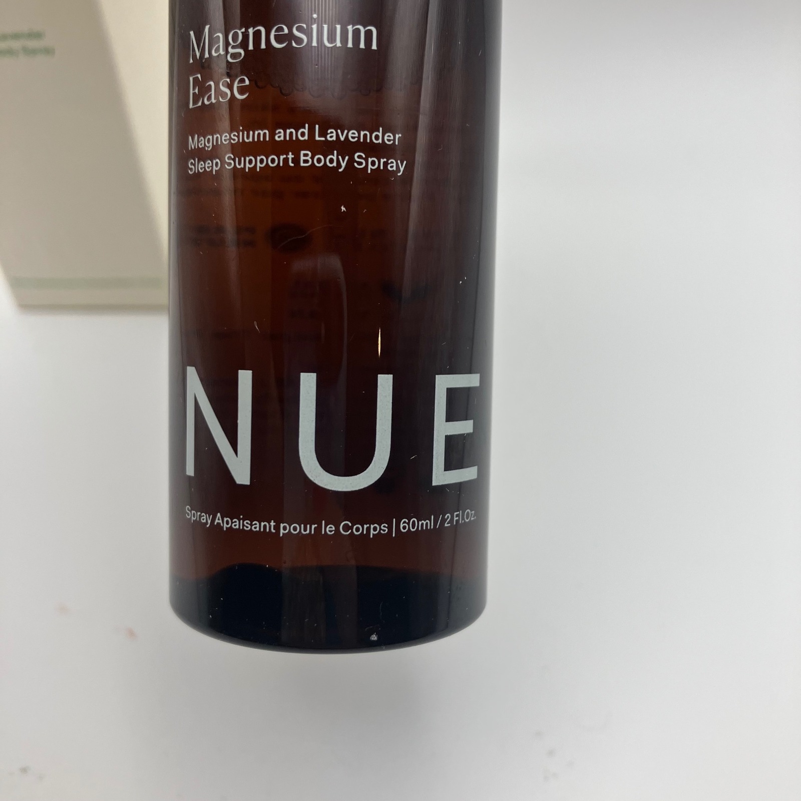The Nue Co Magnesium Ease, a calming sleep support body spray. Infused with magnesium and lavender, this spray promotes relaxation and restful sleep. The formula contains magnesium chloride, a bioavailable magnesium extract, lavender extract, and arnica extract. Simply spray onto clean, dry skin before bed or after a workout and massage in for optimal absorption and muscle recovery. Free of fragrance, colorings, silicones, and skin barrier-damaging ingredients.