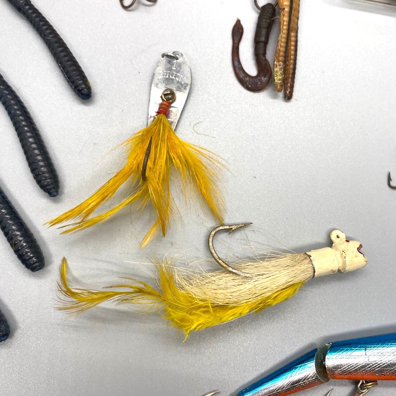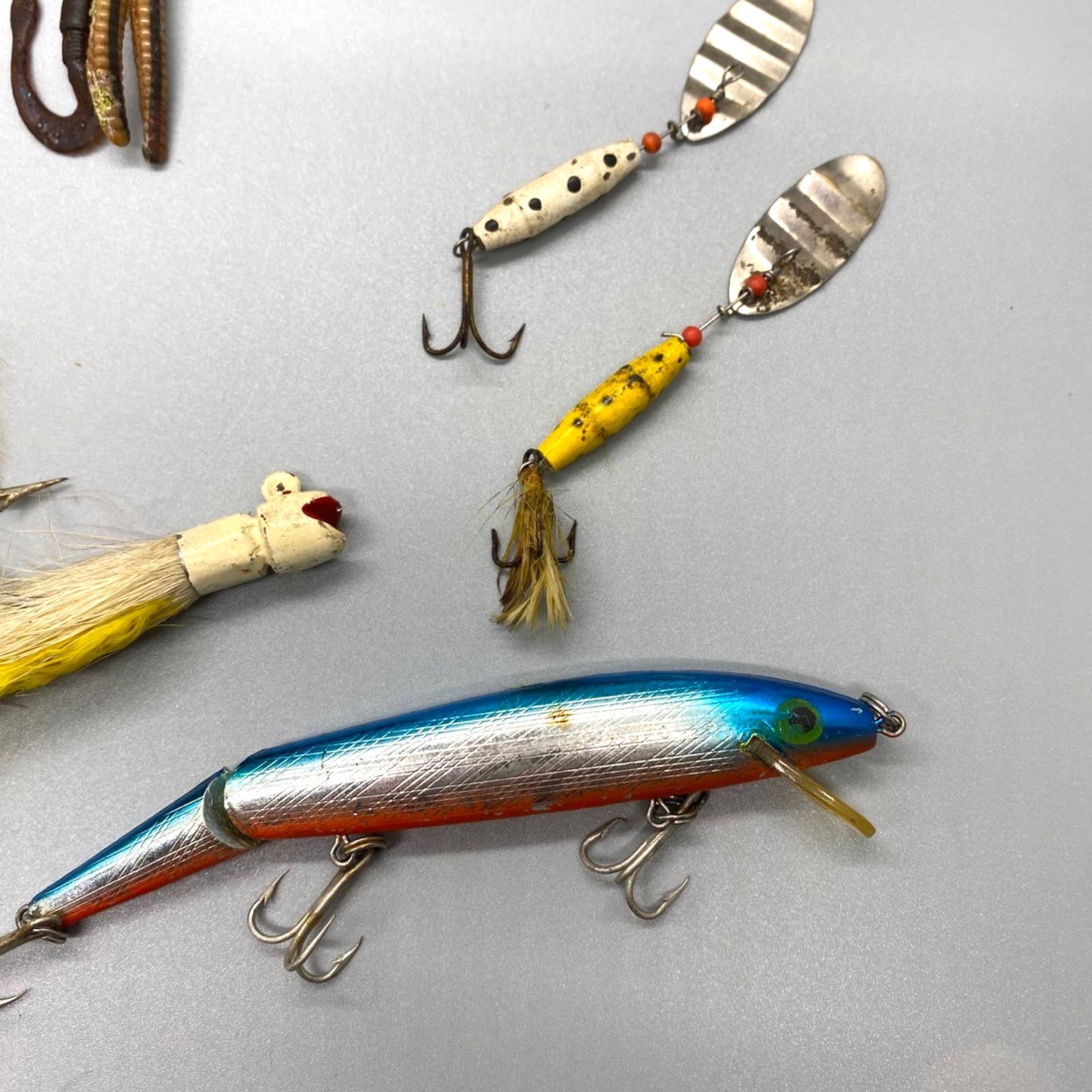 Vintage lot of lures worms hooks and sinkers. A few are marked Rebel and 2 are marked made in Japan, possibly Abu Garcia, but I am not a lure expert. One also appears to be handmade. Please see photos for more description and condition.