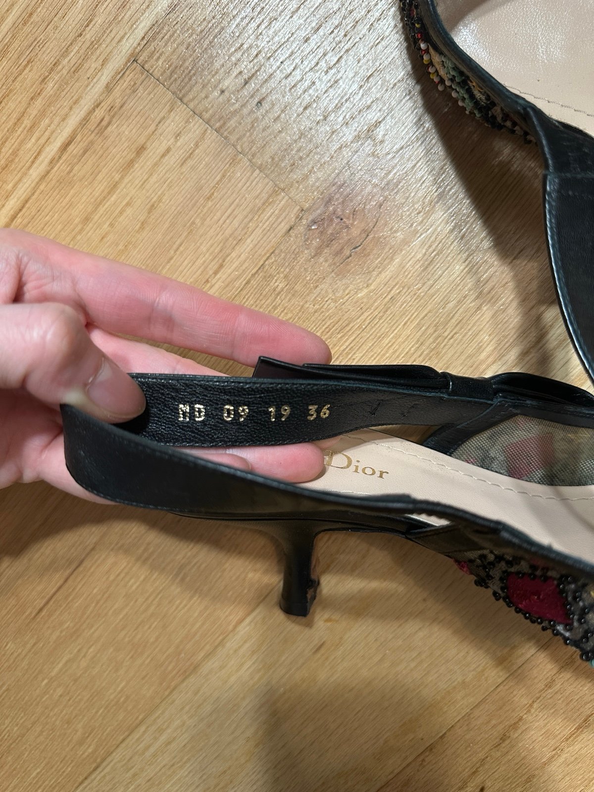 These elegant pumps are crafted of embroidered fabric with beaded embellishments, and feature a black leather sling-back strap with a leather bow, a pointed toes, and a 3-inch heel.