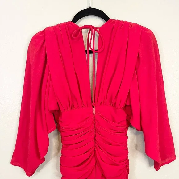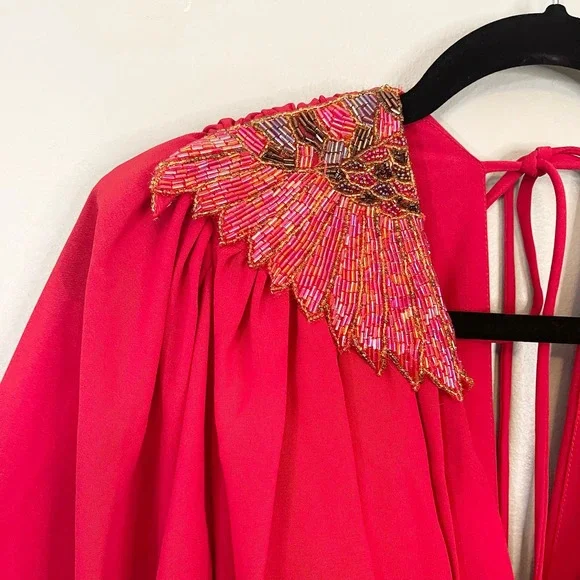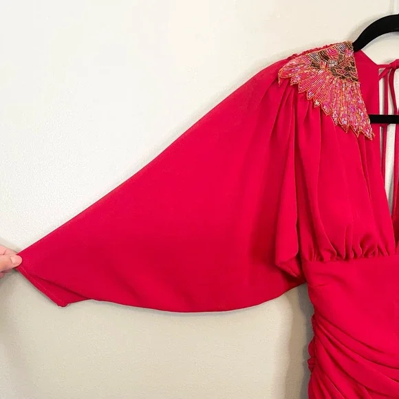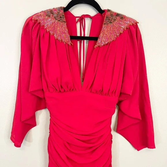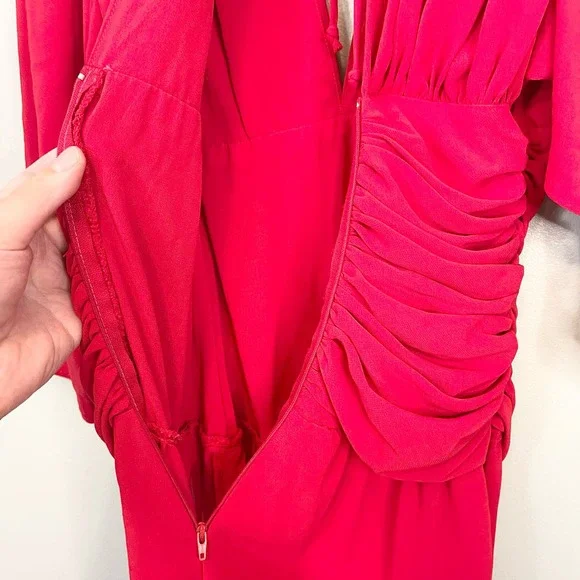 Casadei Women's Red V Neck Embellished Beaded Batwing Ruched Jumpsuit Size 5Brand: CasadeiDepartment: Women's/JuniorsSize: 5Color: RedMaterial: 100% PolyesterCondition: Preloved, and in Excellent conditionFeatures:Deep V-NeckPleatedBatwing sleevesTie on the backShoulder paddedEmbellished with BeadsBack zip closureRARE FINDFlat Lay MeasurementsPit to pit: 13"Inseam: 20"Length: 49"📸 Find me on Instagram FRUGALFASHIONISTA_ for 💁♀️ tips🎁 Bundle Discounts on Multiple Items📦Fast Shipper🚭Smoke FreeBIN AI#0826