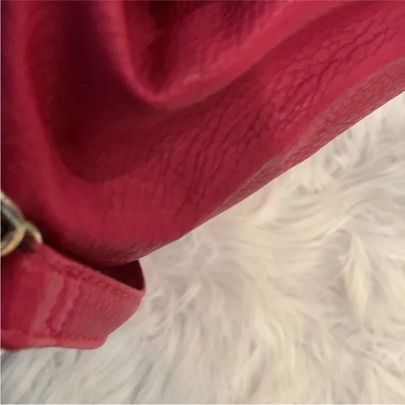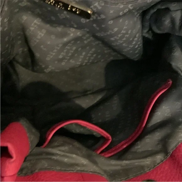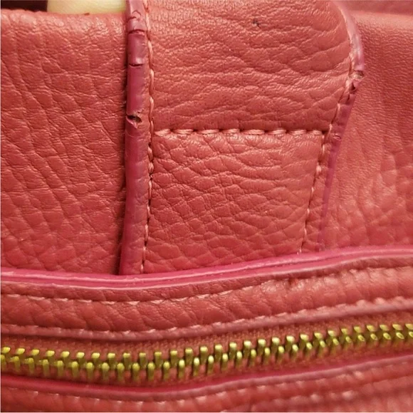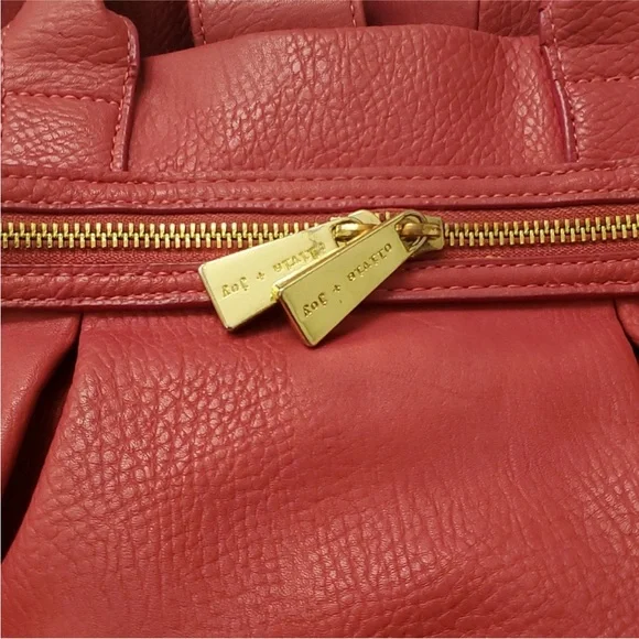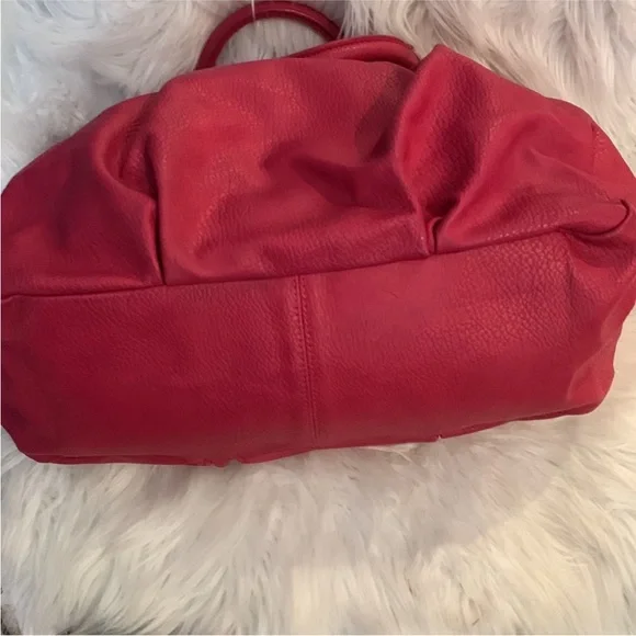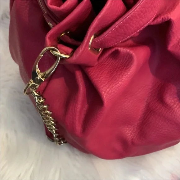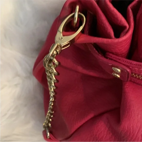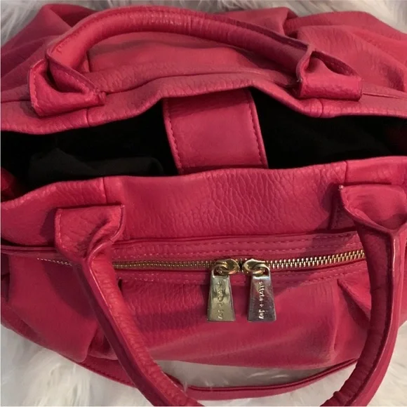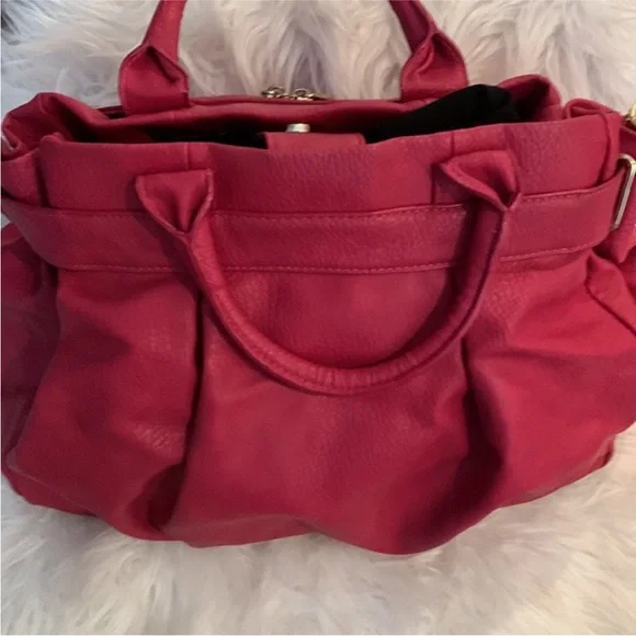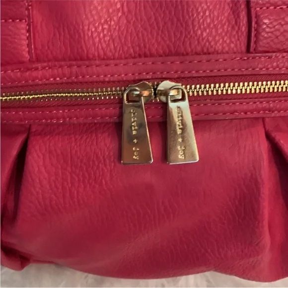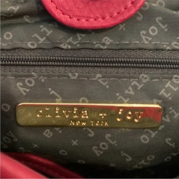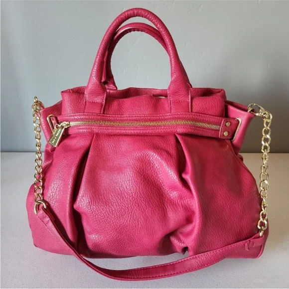 "EUC" Beautiful Looking Fushia / Pink Satchel By Olivia & Joy. Pebbled Faux Leather, Dual Top Handles w/5" Drop, Removable Chain & Faux Leather Shoulder Strap, Snap Top Closure, 1Interior Zip & 2 Slip Pockets, Clean Logo Textile Lining, Gold Tone Hardware & Faux Zipper Detail in Front, Bag Measures 12 X 14 X 6.5 approx.Great Condition, No Wearing/Corners/Stains:) Rt 120.00 approx. Pleated Front & Back Large in size.Minor flaws, look pictures as part of description.
