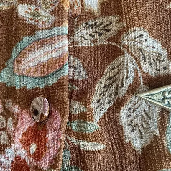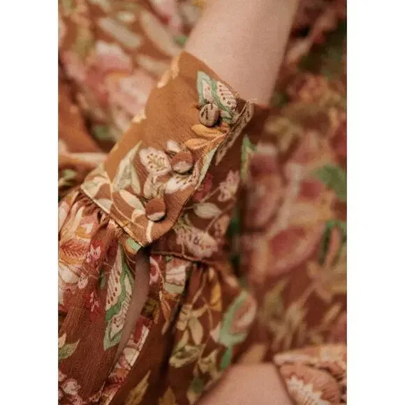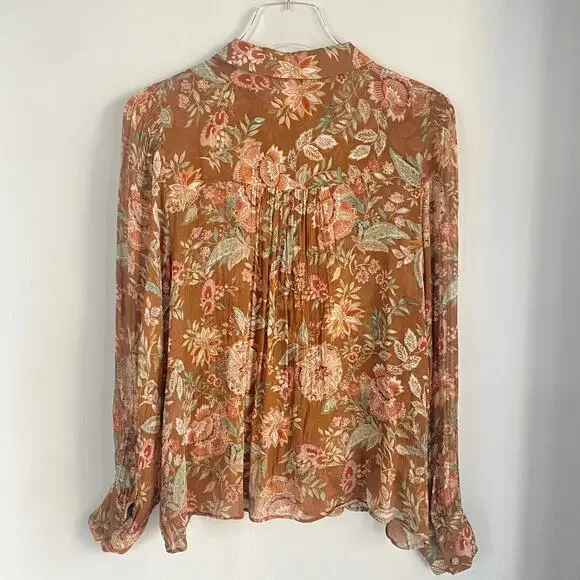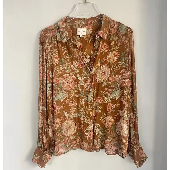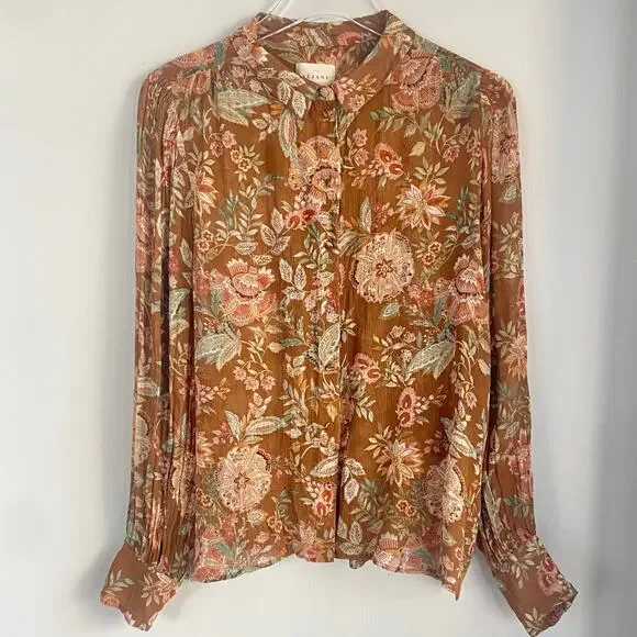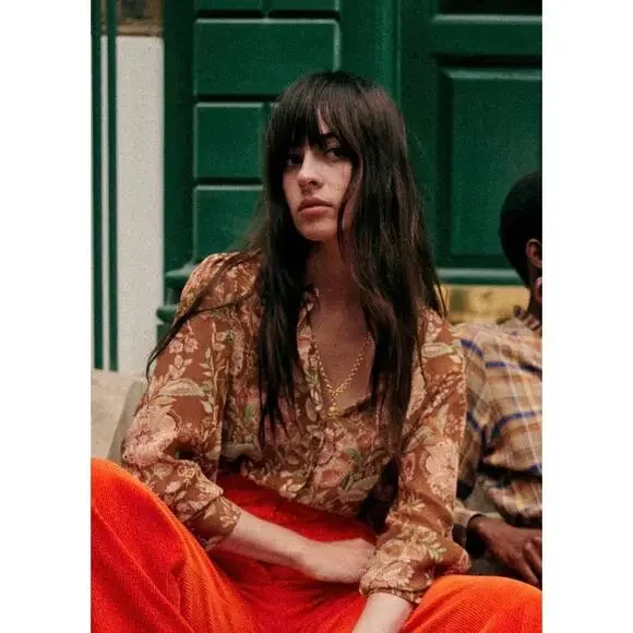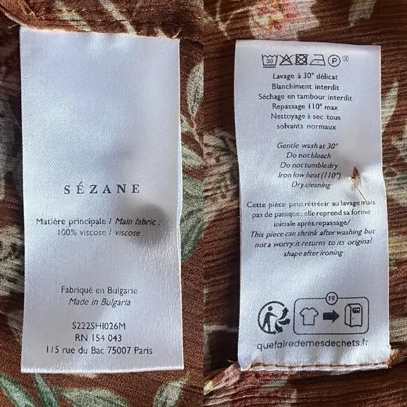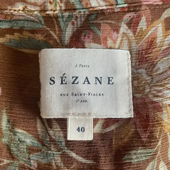 The Tianna Shirt from Sezane is a loose and flowing shirt with long sleeves with tightened cuffs. Button placket on the front with covered buttons. Multicolor floral print. Condition: Great pre-owned (one small pull as noted in photo)Material: 100% ViscoseSize: FR 40 / US 8Color: Brown, Tan, Green, WinePit to Pit: 20”Sleeves: 25”Length: 23”