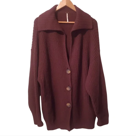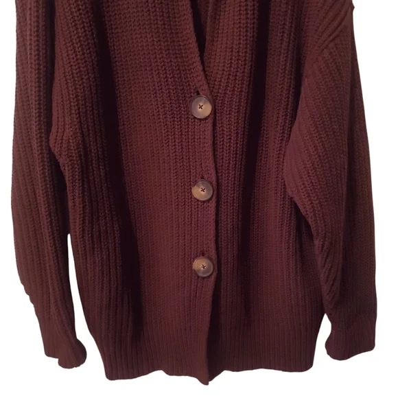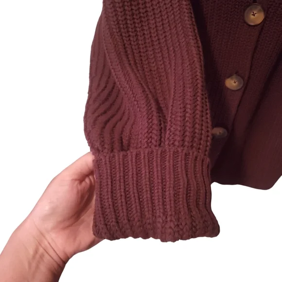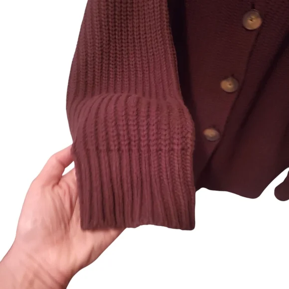 Style No. 63560858Your new go-to cardigan featured in a forever classic knit fabrication and longline, button-front silhouette with exaggerated collar detail for an added special touch.Slouchyoversized silhouetteChunky knitted Dropped shouldersSide pocketsExaggerated sleeves Front button closure Fabric content:1% Elastane1% Polyamide40% Acrylic58% CottonSize MColor BrowmMeasurement laying flat:Armpit to armpit 25"Length shoulder to hem 29"Excellent condition, barely worn, almost like new condition.Keywords: Neutral, Boho, Bohemian,