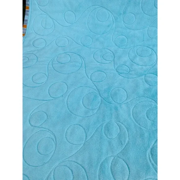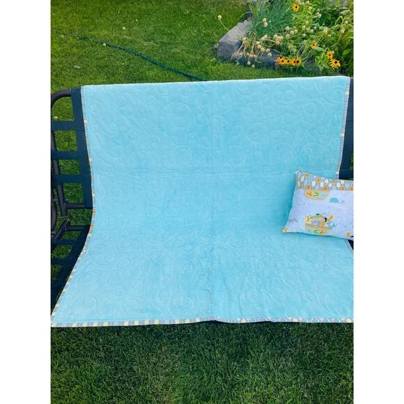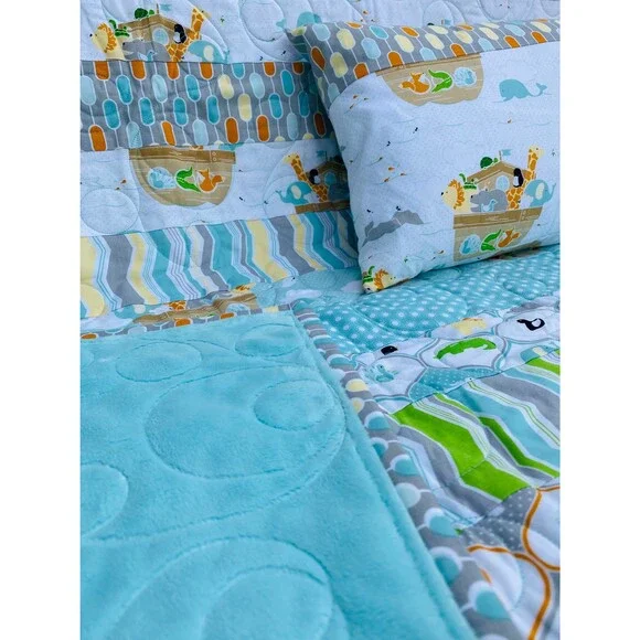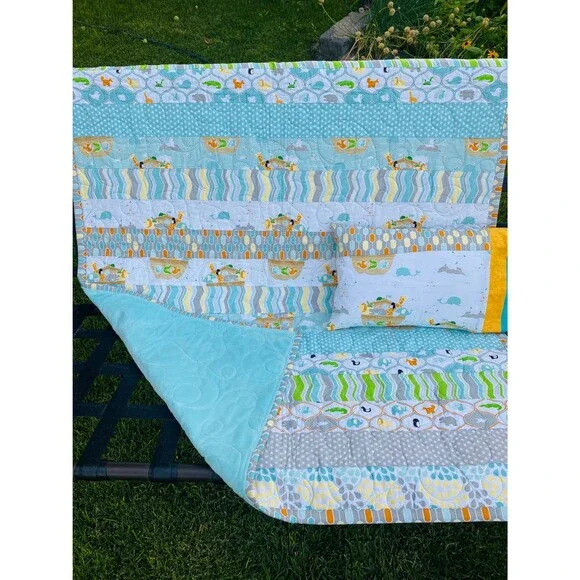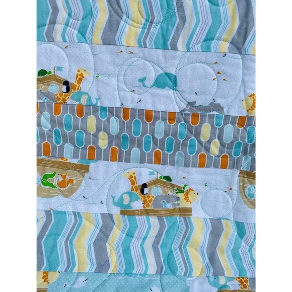 I made this for a baby, child or toddler with a pillow to go with it.I love how it turned out.Beautifully quilted in a unique looped fashion with a dynamic border.Alternating strips of fabric alternating between eclectic designs and Riley Blake animal print fabric.Complete with a pillow with Noahs Ark animals that any child would love.