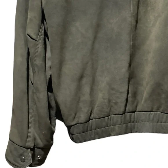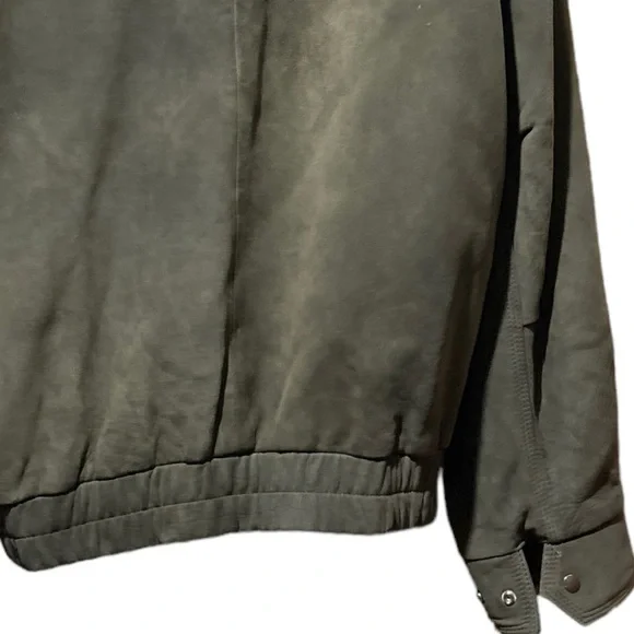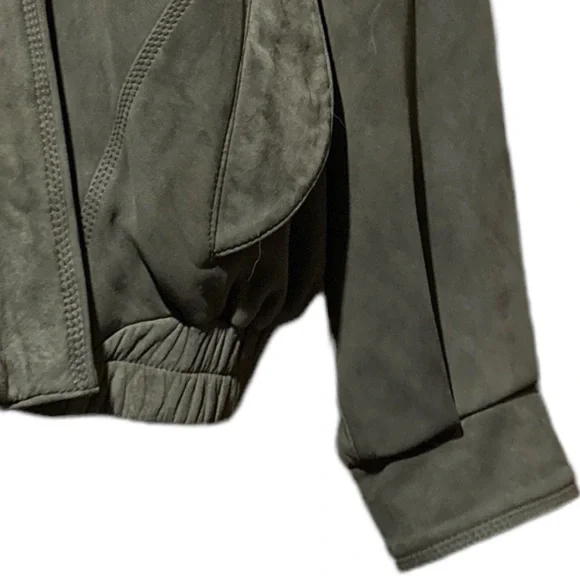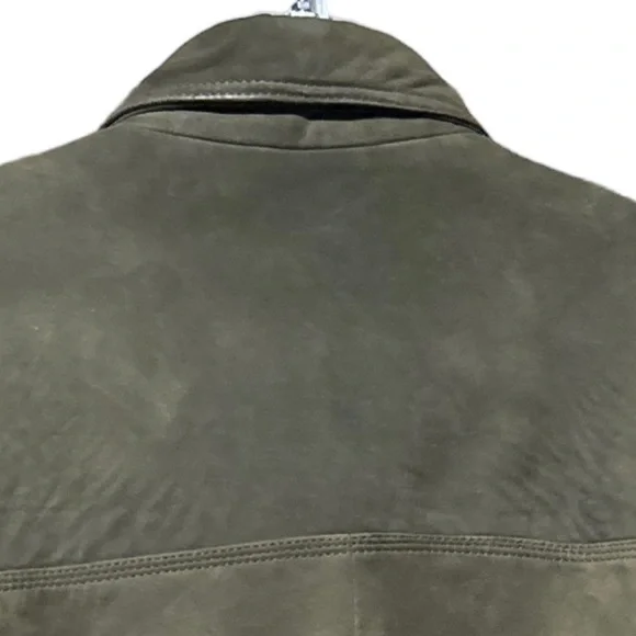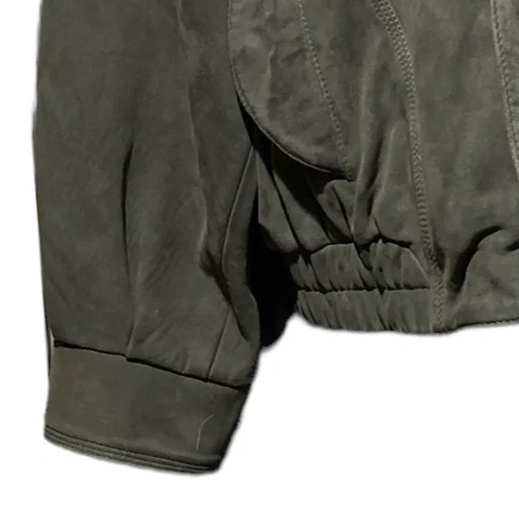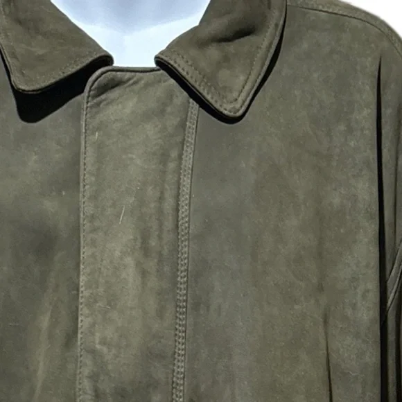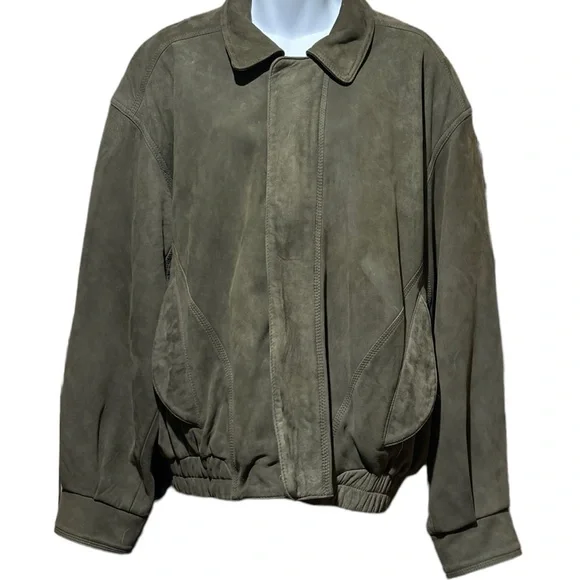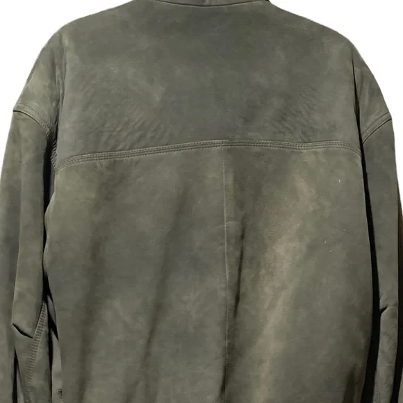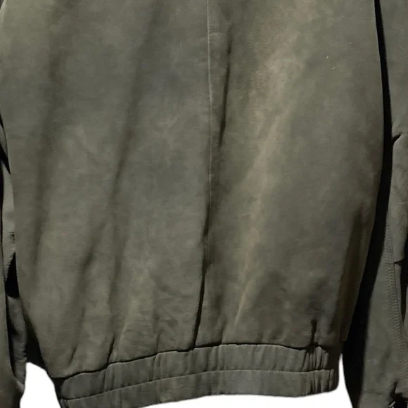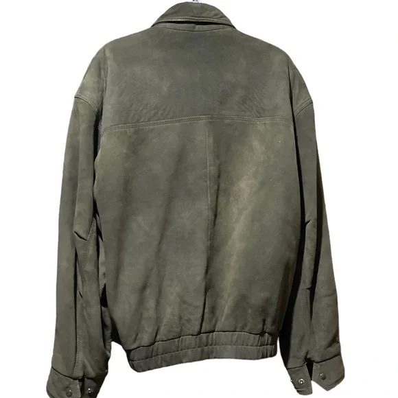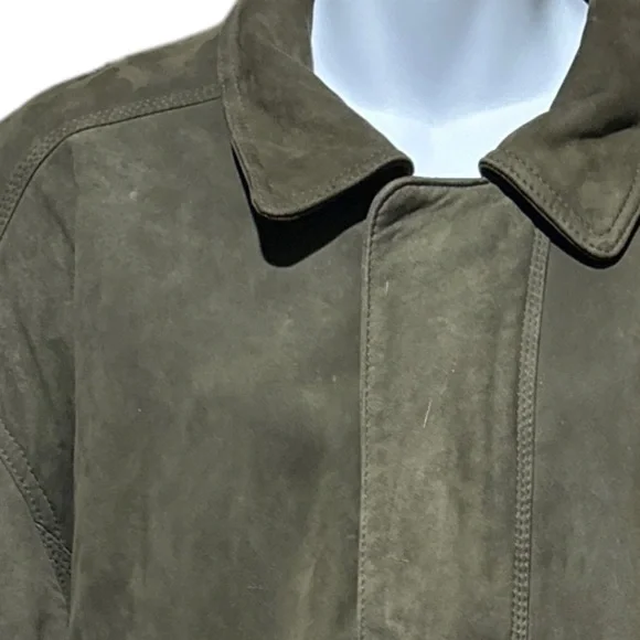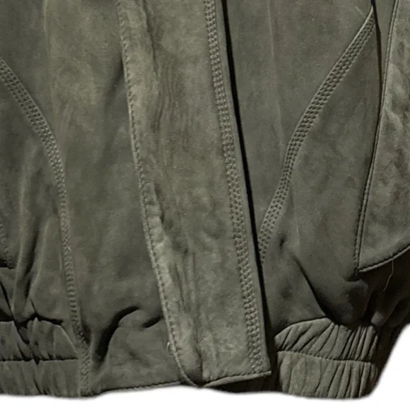 Paul Stuart Green Suede Bomber Jacket. Size 40. (L/XL). Olive Green. 100% Genuine Suede. In Pristine ConditionElevate your everyday fall look with this expertly tailored, buttery soft suede jacket. Designed with classic details. On trend for 2023 it is perfect for a man or oversized on a woman.Buttery soft suede in a perfect Olive Green. Nylon InteriorSide Entry Pockets With FlapSits at WaistMade in ItalyFull Zip/No Buttons Or Snaps Down FrontCollaredOne Snap At CollarApproximate MeasurementsPit To Pit 26"Length 28"