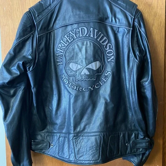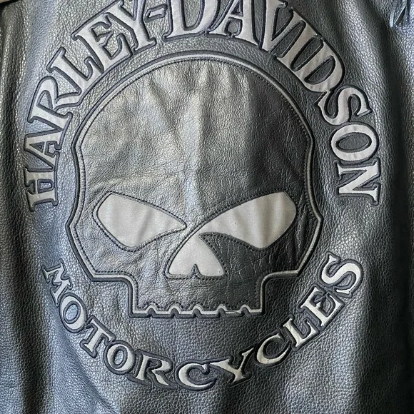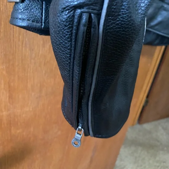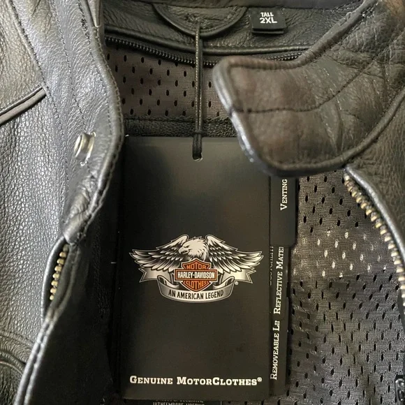NWT! Men’s Harley-Davidson mid weight cowhide leather with fixed poly mesh lining. Two shoulder vents and horizontal back vent. Body armor pockets at elbows and shoulders. Snap-tab mandarin collar. Two-way zipper front. Slightly padded shoulders, elbows and back waist. Action back. Slightly pre-curved sleeves with zipper cuffs. Snap waist tabs. Two zipper hand-warmer pockets, two zipper chest pockets and two inside pockets. 3M™ Scotchlite™ Reflective Material piping. 3M™ Scotchlite™ Reflective Material embroidered appliqué graphics on right sleeve and back. Smoke-free, pet-free home.